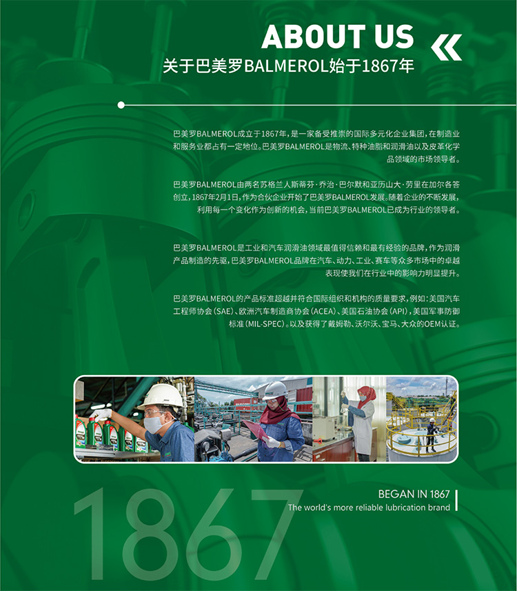 巴美羅BALMEROL成立于1867年,是一家備受推崇的國際多元化企業集團,在制造業和服務業都占有一定地位。巴美羅BALMEROL是物流、特種油脂和潤滑油以及皮革化學品領域的市場領導者。